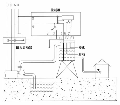 當(dāng)液位升到E1時(shí),E1、E2、E3電極經(jīng)液體導(dǎo)通,此時(shí)控制回路E1與E2在控制器內(nèi)相接,②、④接點(diǎn)由常閉轉(zhuǎn)為常開,電磁開關(guān)失電,水泵停止,同時(shí)由于E1、E2相接致使繼電器自鎖,此后液位下降,同時(shí)指示燈轉(zhuǎn)換為紅燈亮。