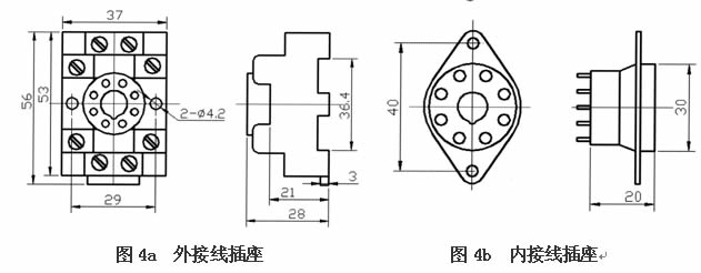 配線插座分內(nèi)部連線和外部連線兩種,用戶可根據(jù)安裝形式選擇其中一種,它的外形尺寸(如圖4)