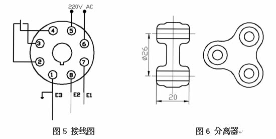 控制器的八腳插頭⑤、⑥ 接220VAC電源上,⑦、⑧、①插腳分別接傳感器電極E1、E2、E3、②、③、④插腳在直繼電器一 組輸出觸點(diǎn)上。